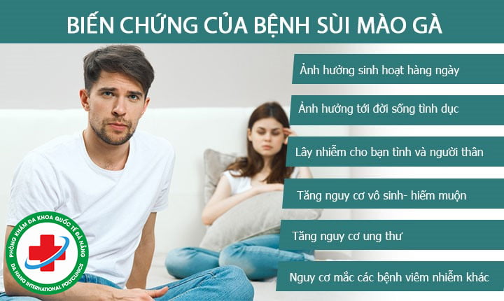 - Giai đoạn biến chứng: Giai đoạn này có thể xem như giai đoạn cuối cùng của bệnh, khi các nốt sùi mào gà có thể vỡ gây ra viêm nhiễm và viêm loét ở các cơ quan sinh dục, có thể dẫn đến các biến chứng nguy hiểm như viêm âm đạo, viêm cổ tử cung.